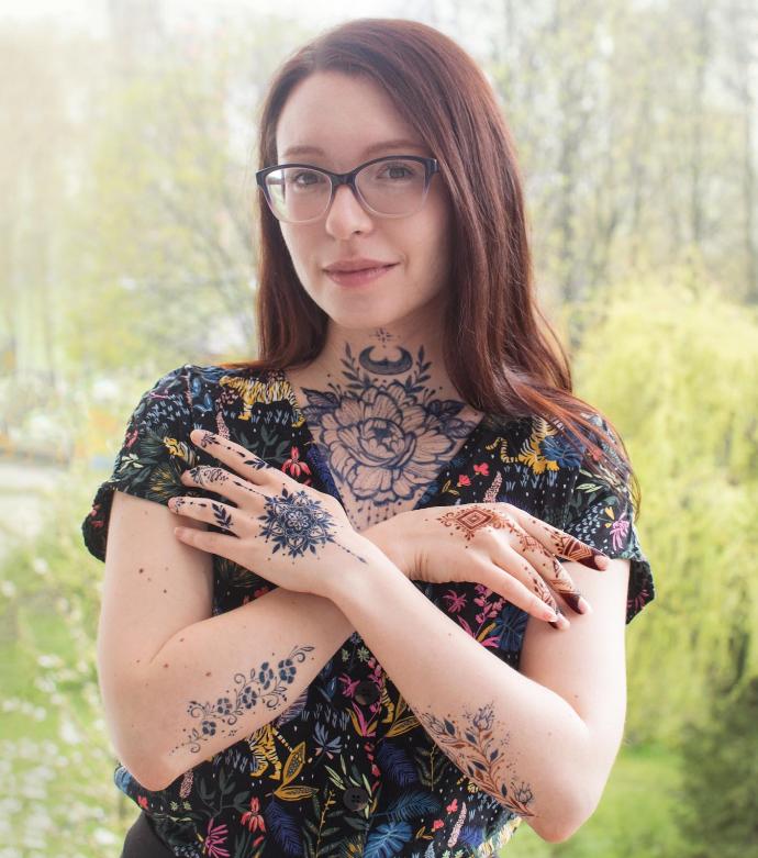 Malowaniem henną zafascynowała się 10 lat temu. Od tamtej pory wykonała wiele wzorów inspirowanych stylem indyjskim, arabskim, marokańskim, wschodnioeuropejskim i nowoczesnym, ale największą przyjemność sprawia jej malowanie kwiatów i biżuterii. Do tworzenia wzorów używa naturalnej henny barwiącej na brązowo, oraz jaguy, która barwi na granatowo. Uwielbia malować zarówno wielkie wzory na dekoltach i nogach, jak i mniejsze wzory na dłoniach.